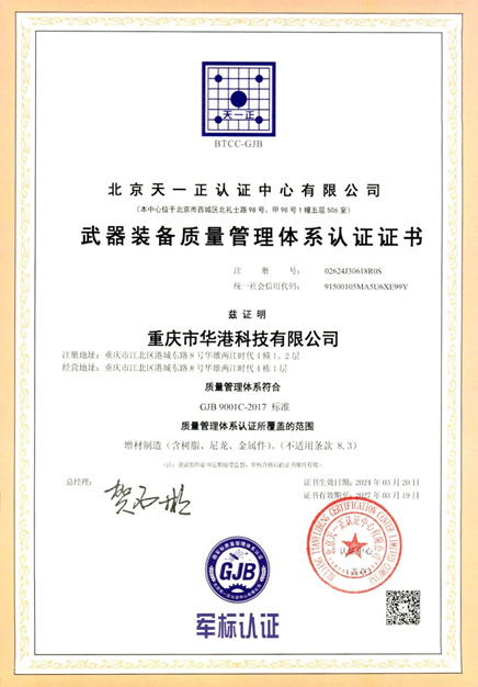 2024年3月,北京天一正认证中心有限公司审核组专家依据GJB9001C-2017《军工质量管理体系要求》对进行了认证审核,审核范围包括:增材制造(含...