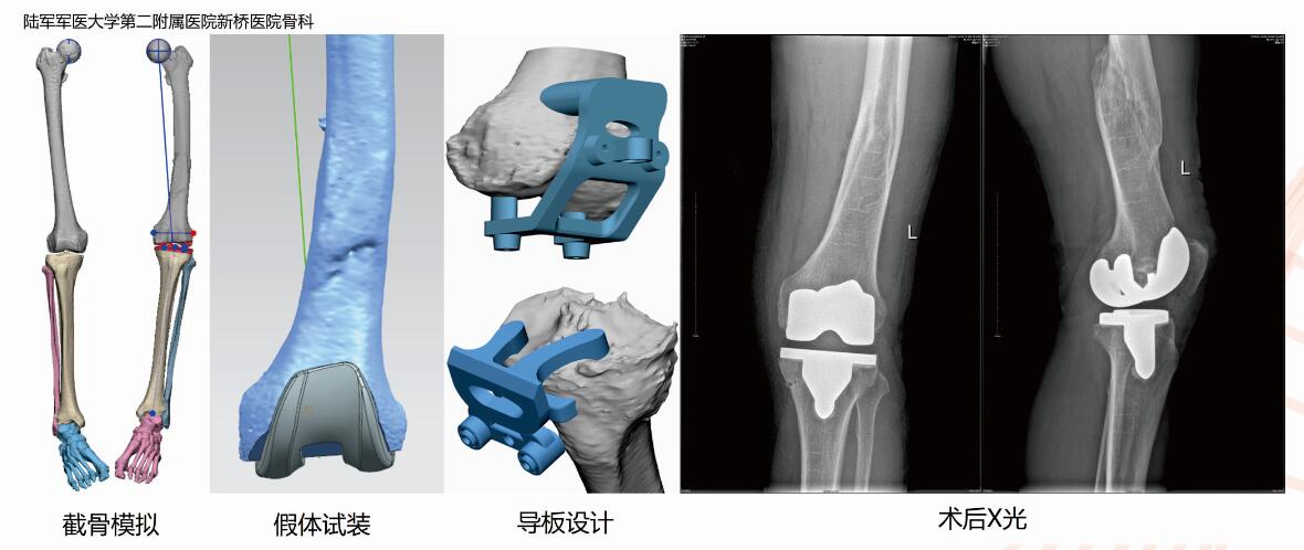 陆军军医大学第二附属医院新桥医院骨科,患者刘先生,64岁,类风湿性关节炎,股骨干陈旧性骨折30年,疼痛4年。因股骨干骨折畸形愈合,髓内杆无法通过或偏差较大,针对类似膝关节患者,医生采用双下肢全长CT扫描,层间距0.625mm,层厚0.625mm,双下肢三维重建,计算机测量外翻角度、旋转角度等,确定截骨位置及模拟假体型号、安装效果,设计截骨定位导板术中辅助截骨及假体安装,以减小术中人为及传统器械设计因素所导致的偏差。