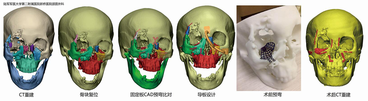 陆军军医大学第二附属医院新桥医院颌面外科,患者唐先生,57岁,因车祸致颌面中部严重骨折,行头部CT扫描三维重建,扫描层厚1mm,层间距0.7mm,骨折块分割复位,计算机模拟钢板贴合,导板设计模型打印,术中导板辅助复位固定,术后复查骨愈合良好,面部形态良好。