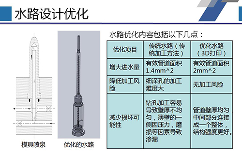 3、水路的设计优化,主要是针对需要改善注塑产品的生产效率,产品的成型品质,而用传统工艺无太多改善的情况。金属3D打印作为一种正在不断发展成熟的新型制造技术,未来将在异型水路模具方面发挥极为关键的作用。