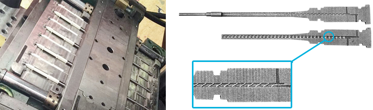 对于模具中随形冷却水路的制造工艺,采用选择性激光金属粉末烧结SLM技术,其产品可以达到正常金属的99.9%的金属致密度和750MPa机加工强度,可以对其进行任何机械加工。