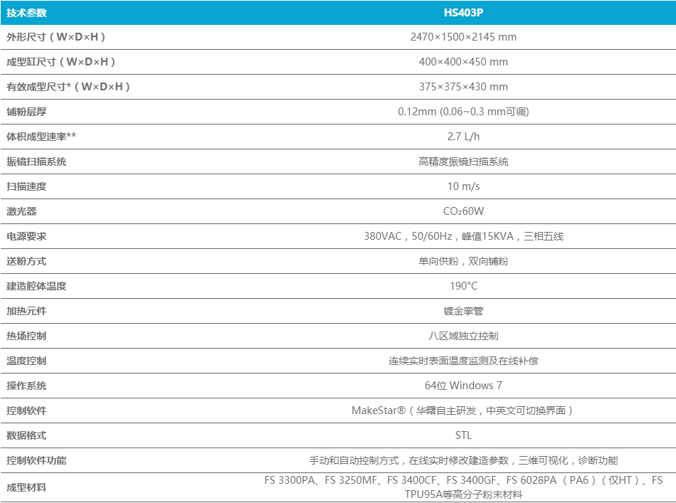 HT403P是第二款可以烧结熔点在225℃以下的材料的设备,在国际上具有领先水平。配合与全球最大的化工集团德国巴斯夫共同研发的纯PA6 3D打印材料FS6028PA,组合成目前市场上唯一既具备大尺寸成型能力,又能烧结PA6材料的3D打印解决方案。与前一代402P系列相比,403P系列成型缸由400×400×450增大至400×400×600(高缸为选配),满足了多数客户更大尺寸工件生产的问题,免去工件拼接的麻烦。新型动态热场温控系统,稳定了动态温度、热场监测、热源补偿,优化密封及传感,不但保证了打印制件的高性能,而且保证了不同批次制件的强度、尺寸精度、热变形等多项性能。与402P系列相比,403P系列扫描速度由最高的12.7m/s提升为最快15.2m/s,层厚提升20%至0.12mm,铺粉速度提至280mm/s,成型速率提至4.0l/h,进一步提升了403P系列的高品质。与打印精度一起革新的,还有更智能的系统软件。403P系列秉承开源理念,推出了Make Star P新一代开源软件,支持实时在线添加或删除工件,其操作系统为64位的Windows 7,使设备性能升级空间更大,能提升操作灵活性及设备性能,并为用户提供持续的免费升级服务。